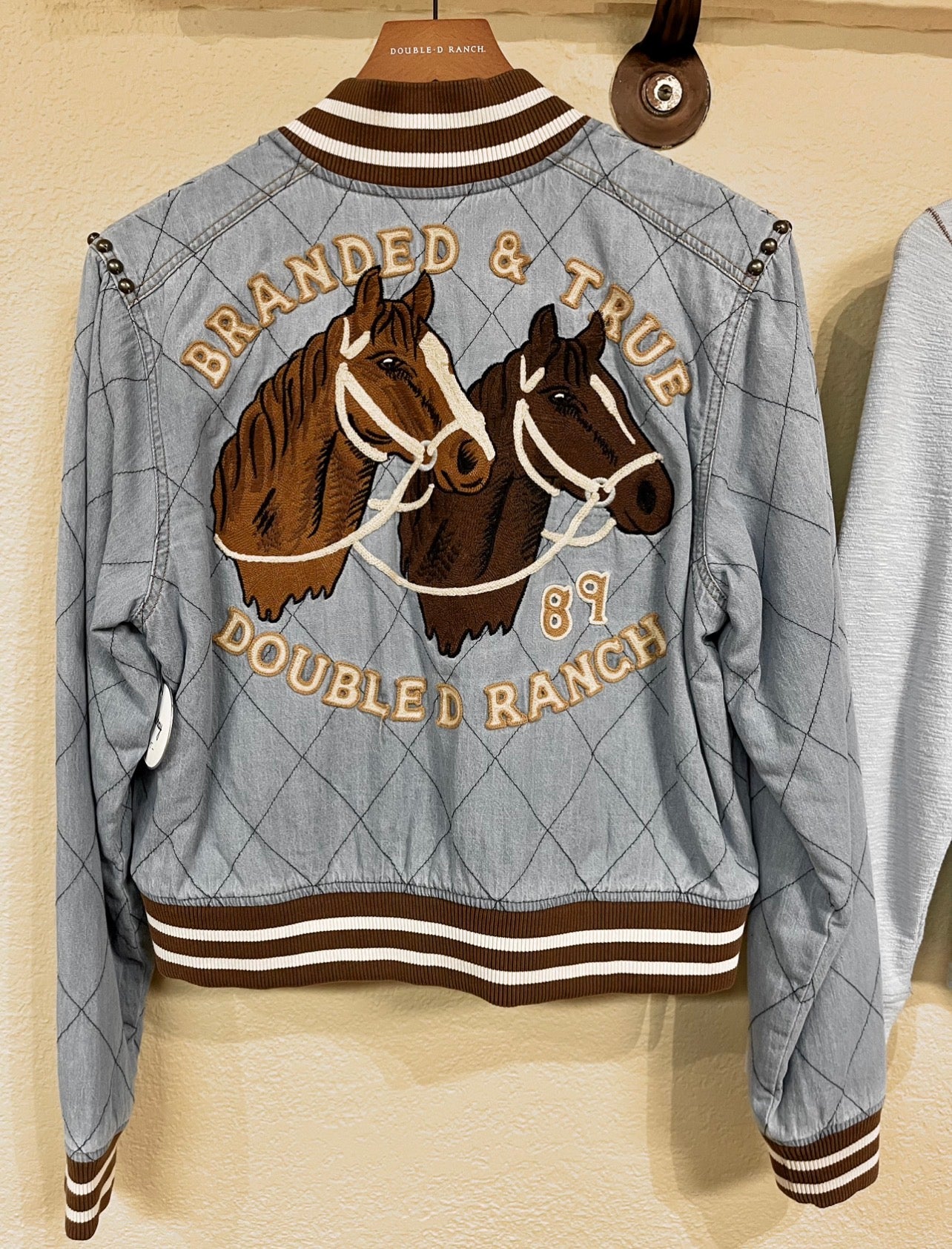 What a dreamy jacket! The classic chambray bomber has elements of English rider, like the askew quilt stitching and (faux) leather flap pockets, but also hints of retro in the racing stripe cuffs, collar, and waistband, and then the back brings in a bit of Western with the embroidered horseheads and wording that are reminiscent of an old rodeo jacket. It’s got a little bit of everything!