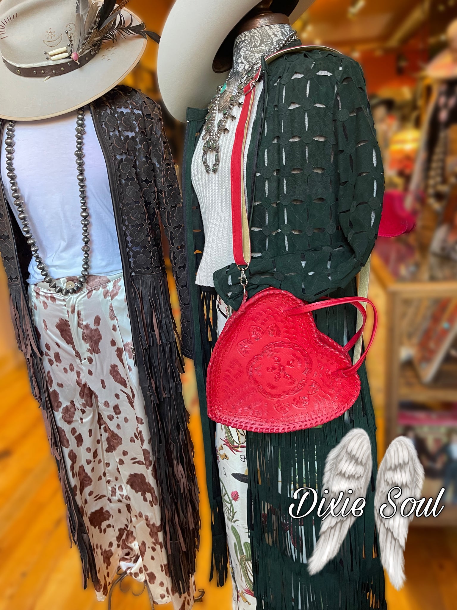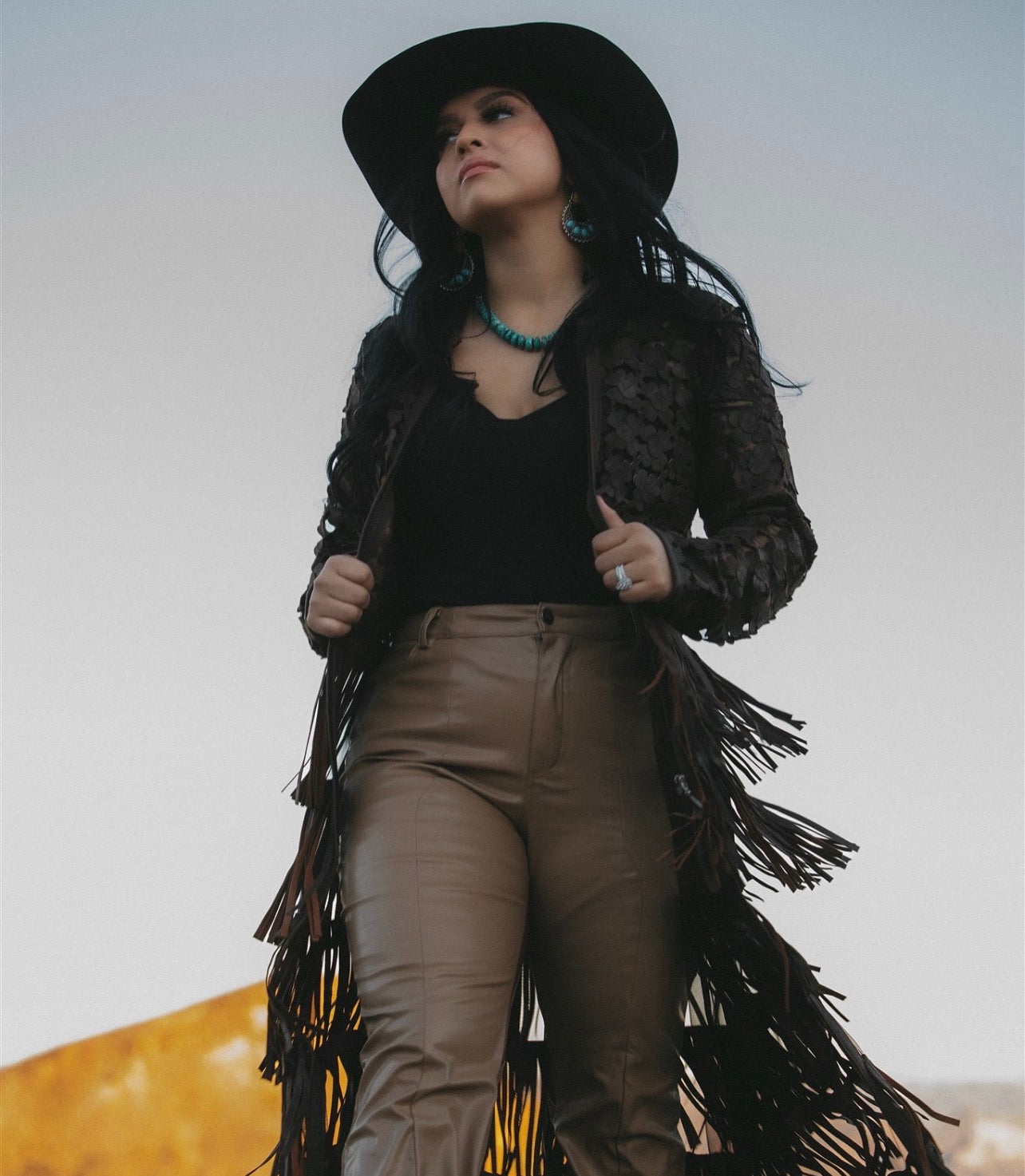 This long duster is crafted with Italian Suede and features layers of fringe on a mesh lace body.