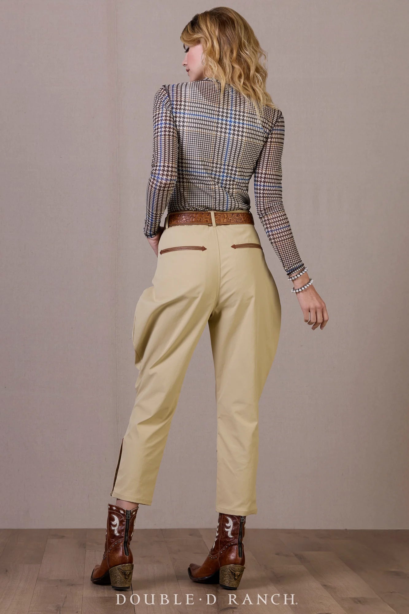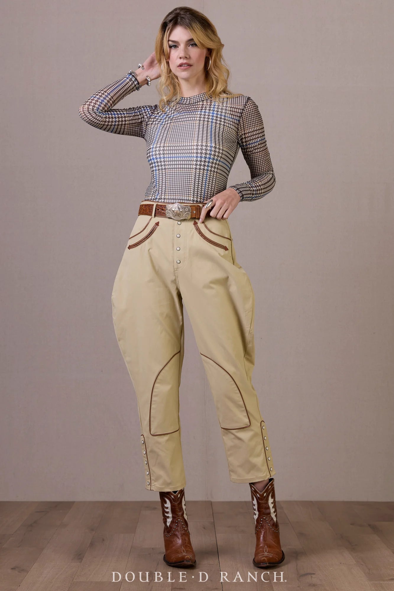 A bit outside the box for us, we are truly enamored with this season’s signature glen plaid print. It has a strong air of equestrian with a hint of East Coast, and yet we’re loving how it works in a Western wardrobe. While we’ve crafted it in cotton and even printed it on leather, this iteration is a scaled-up version on a poly-spandex blend, designed to have semi-sheer slim fit that’s going to be absolutely lovely for layering.