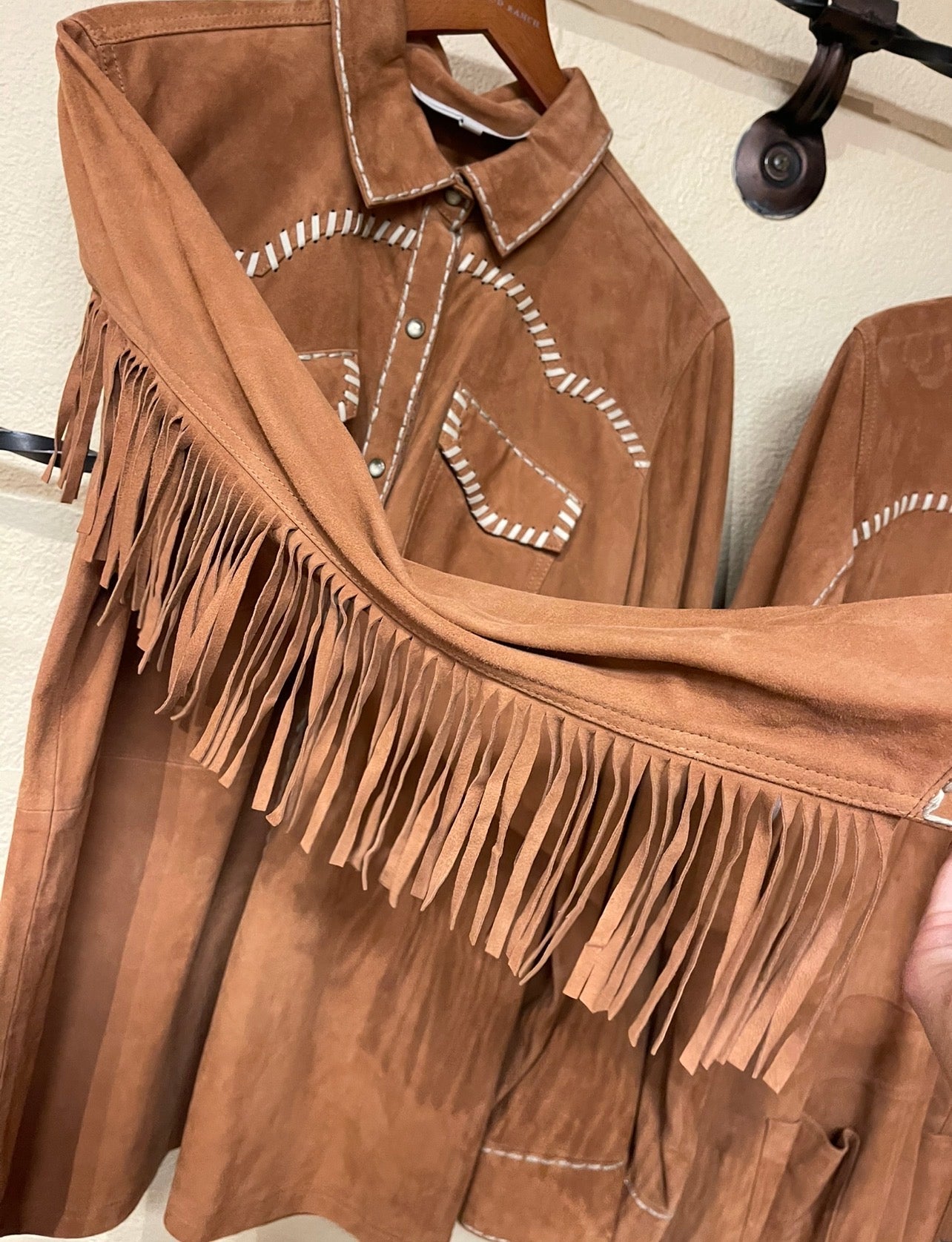 This jacket is beautiful and brilliant in every way. It’s crafted in a gorgeous ‘bridle’-hued goat suede complemented with white contrast stitching and leather whip-stitch lacing, and finished with a classic pearl snap placket. But here’s the genius of it: the effortless silhouette and neutral tone make it as easy to wear as any jean jacket, but the suede and the fringe adds an edge, so it’s essentially a staple that could become your signature piece. An absolute must-have on every account.