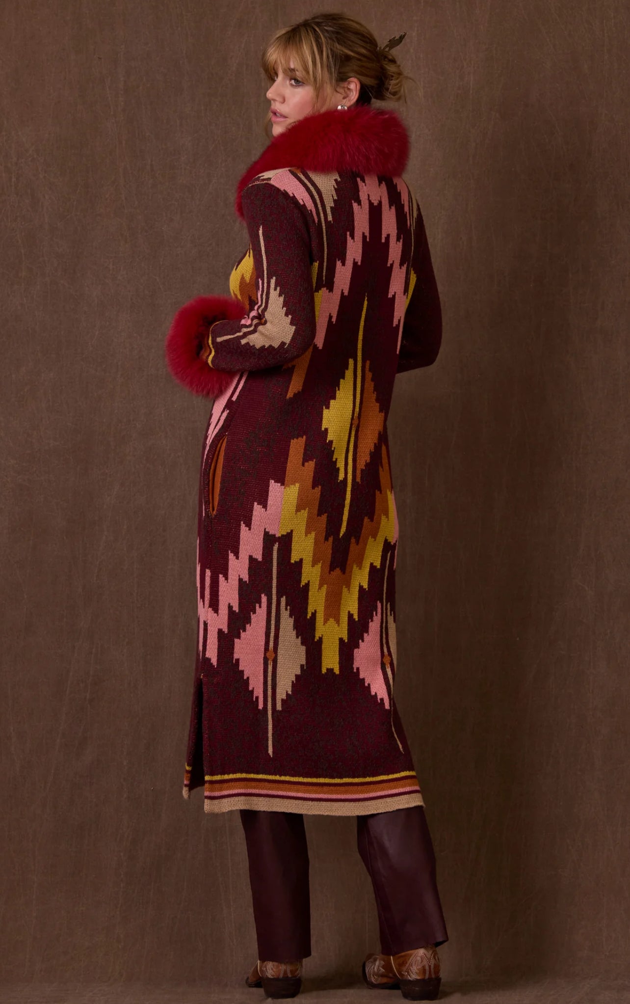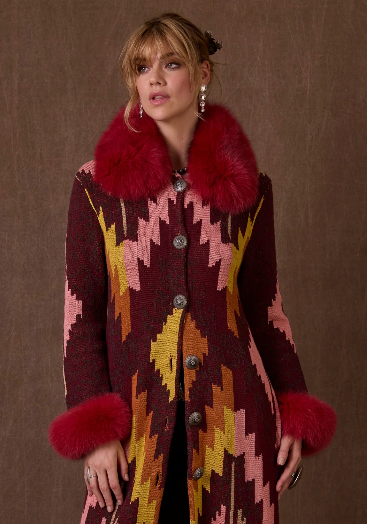 As Seen In Cowboys & Indians Magazine. The beautiful blanket-inspired print weaves together the season’s signature berry hues with complementing contrasts of sunset yellows and oranges, finished with statement-sized custom concho buttons and impossible-to-ignore full volume red fur collar and cuffs. It’s irresistible from every angle!
