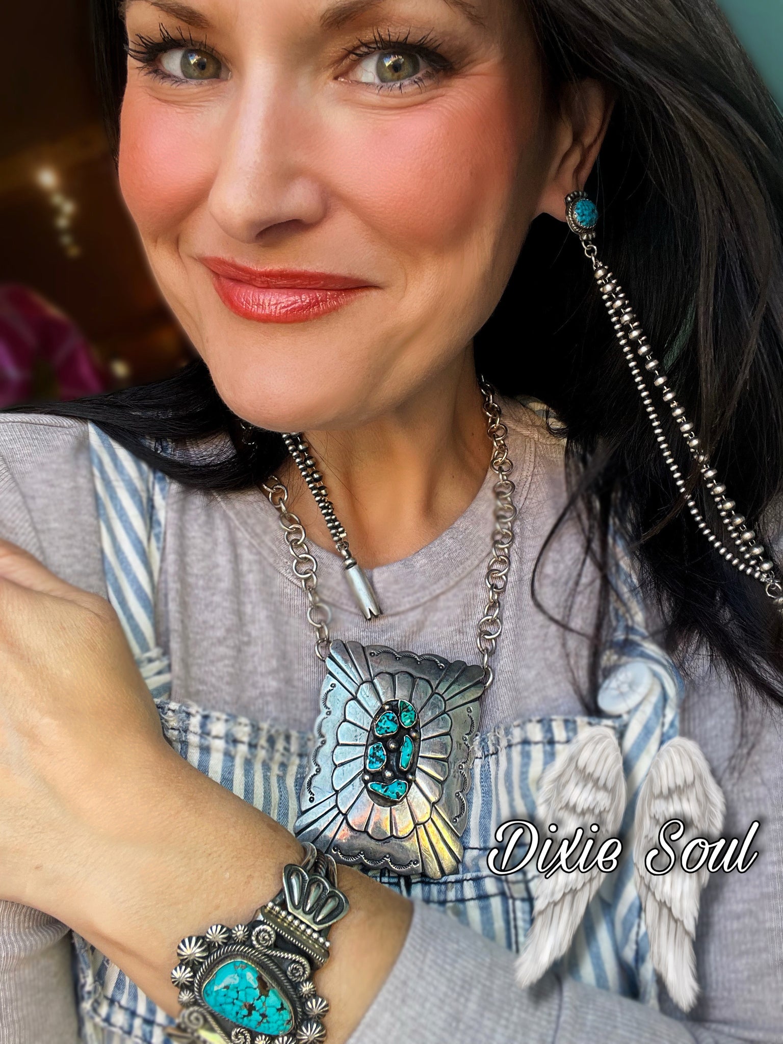 Statement Earrings: Earrings: Have you ever seen longer earrings? The length of these sterling silver pearl with kingman turquoise post backs drew me in…..the curiosity of having earrings this long intrigued me and sold me! 7.25” in length. Are they heavy? I would consider these a medium weight…a good ‘going out’ pair. $349