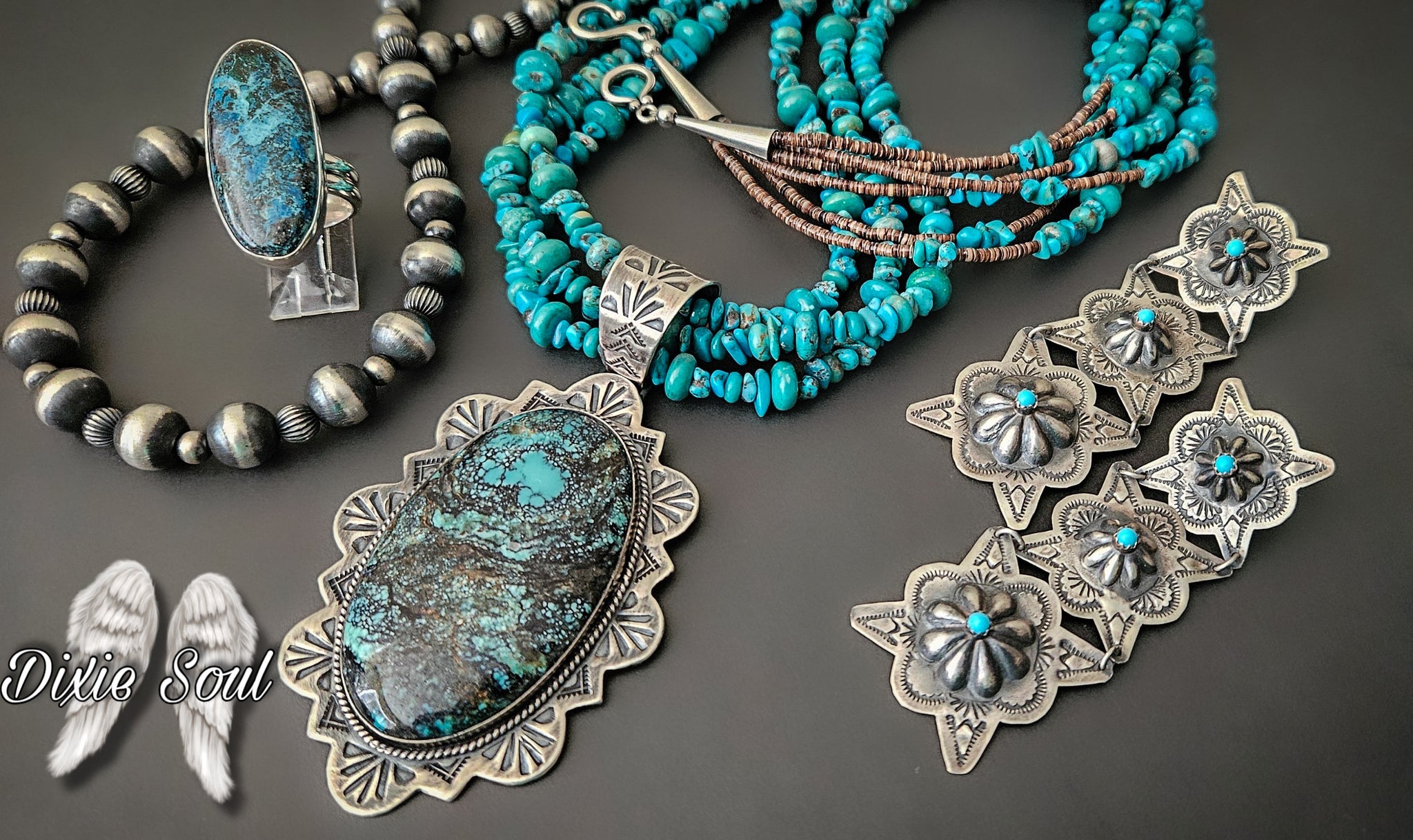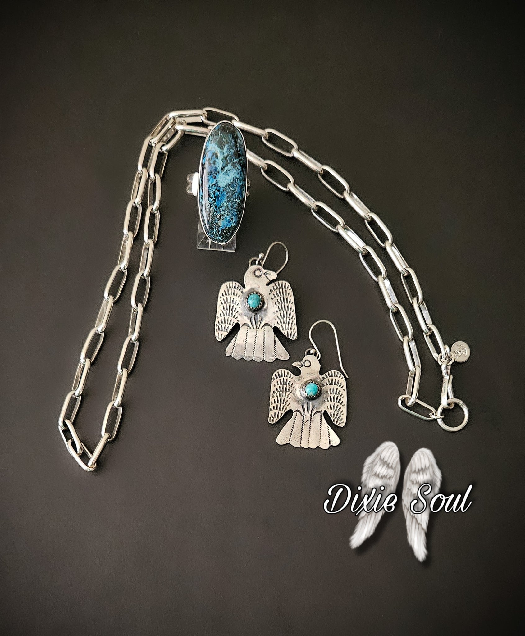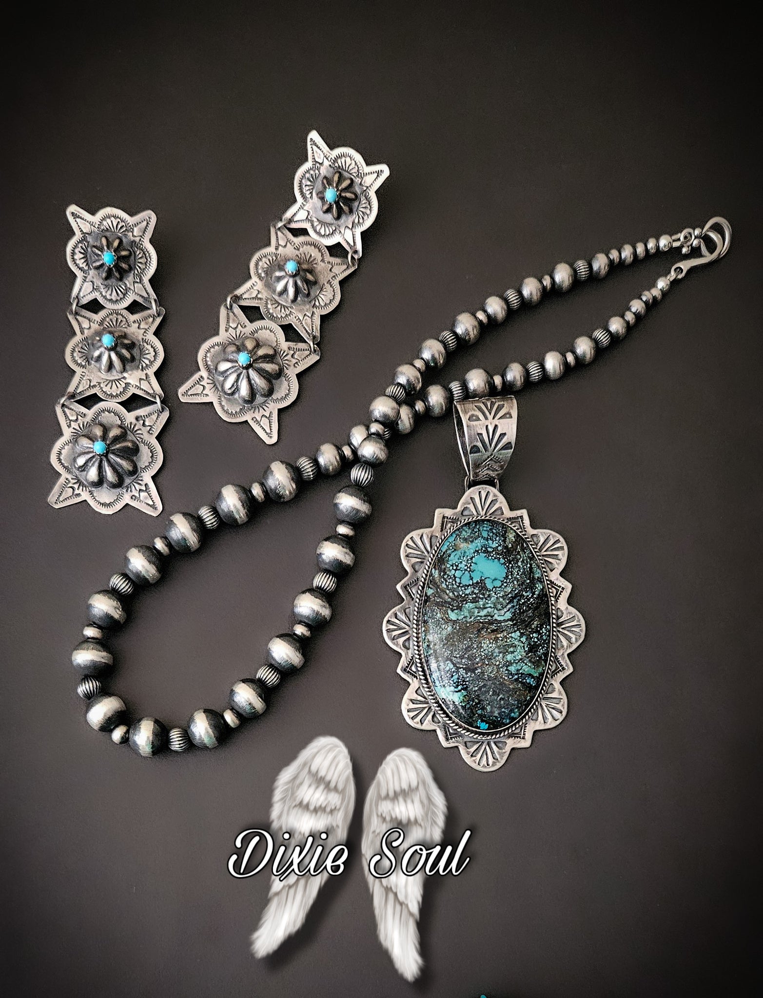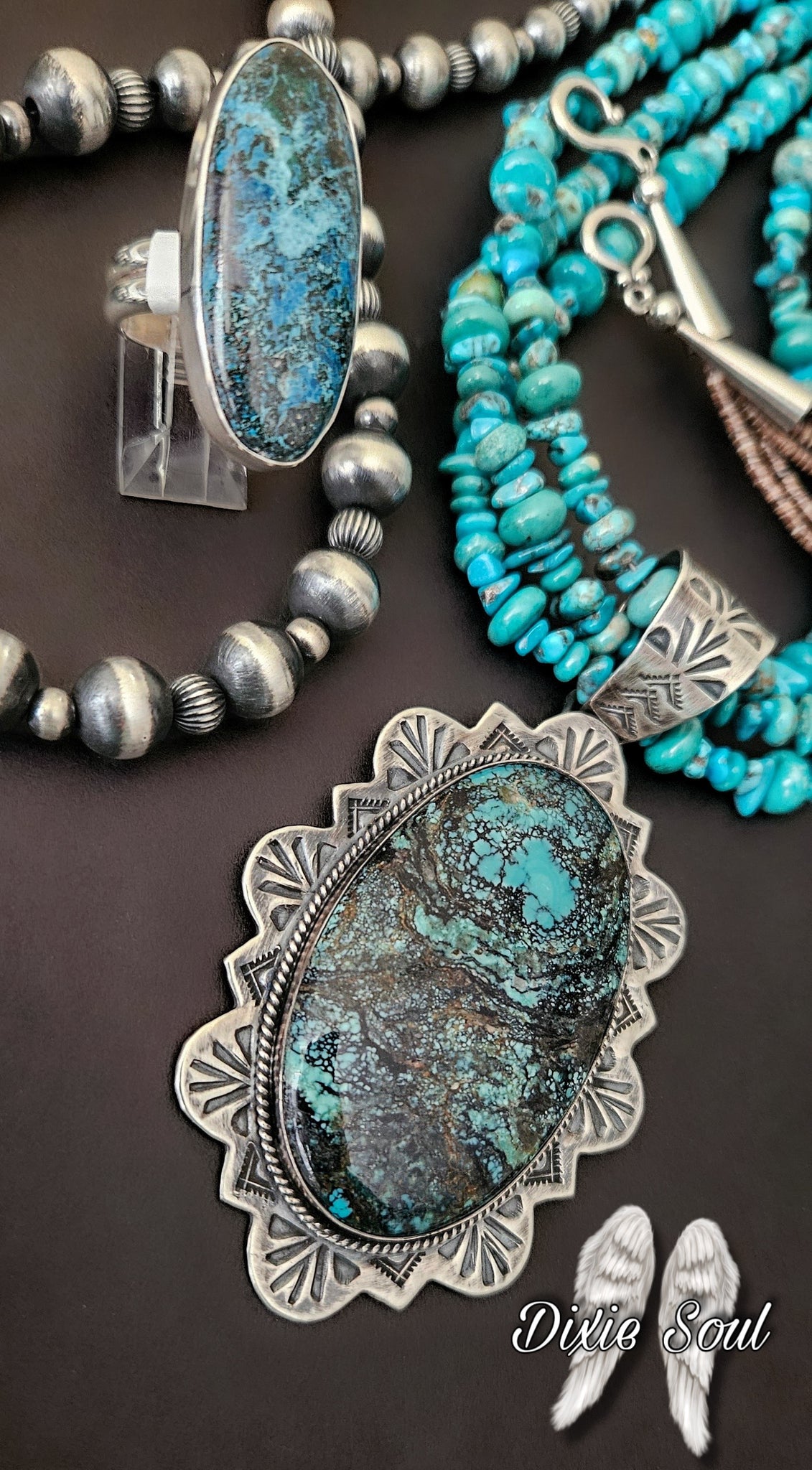 Kingman pendant: 2.5” by 2” set in sterling. $600.