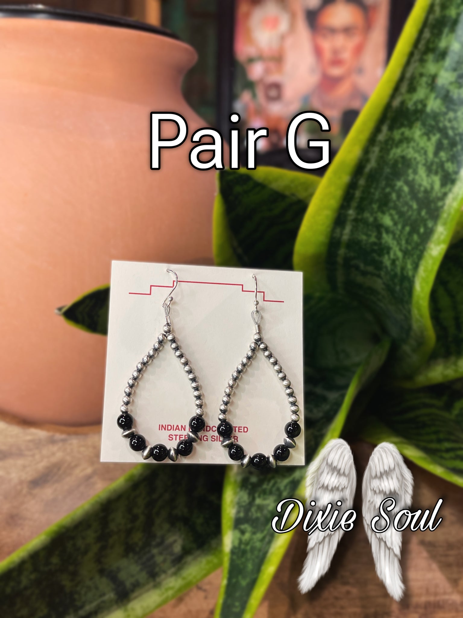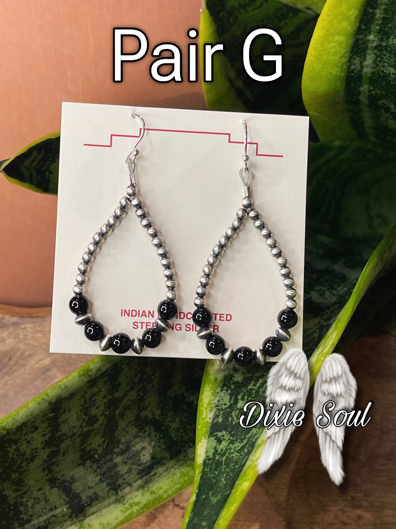 Pair G: 2.5” 3mm sterling pearls, aprx 5mm onyx, sterling saucer spacers $69