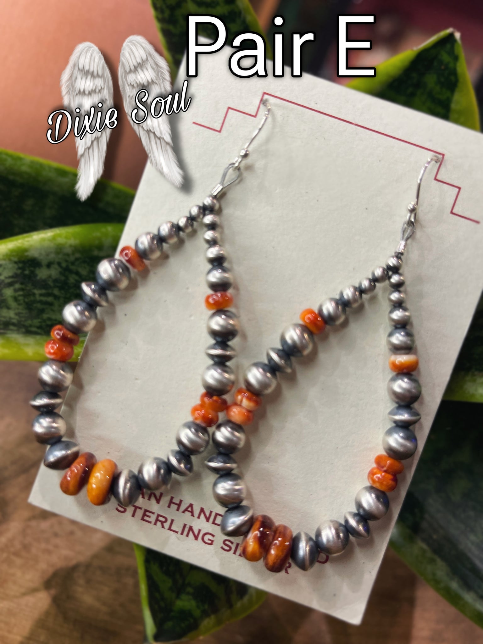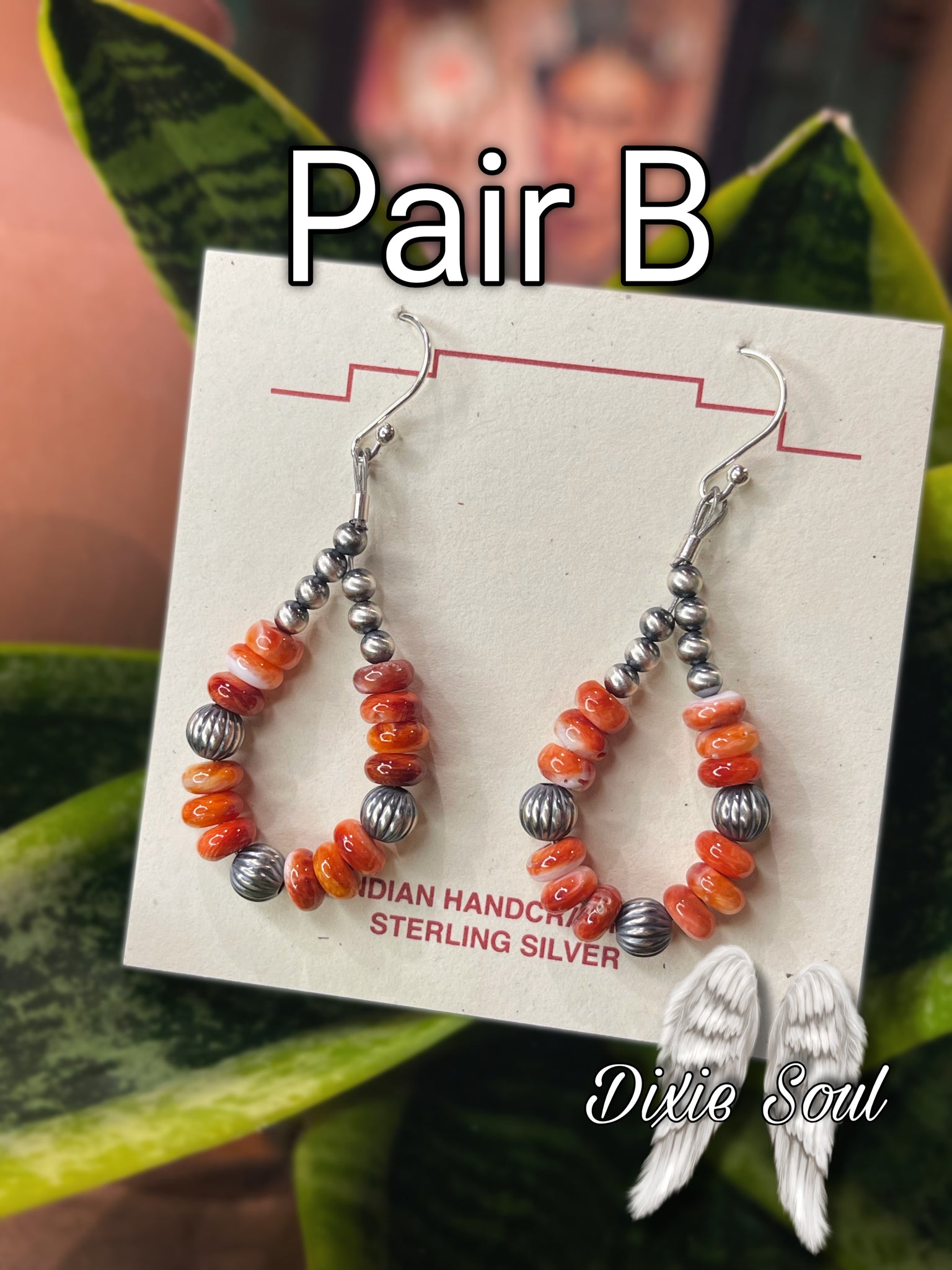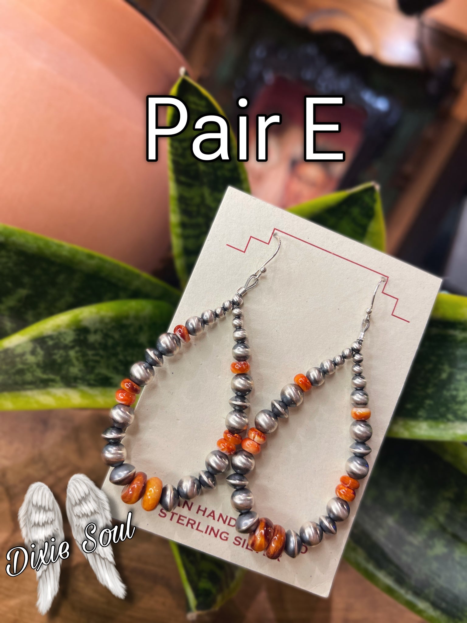Pair E: 3” 3-6mm sterling round, sterling saucers and reddish-orange spiny oyster. $93