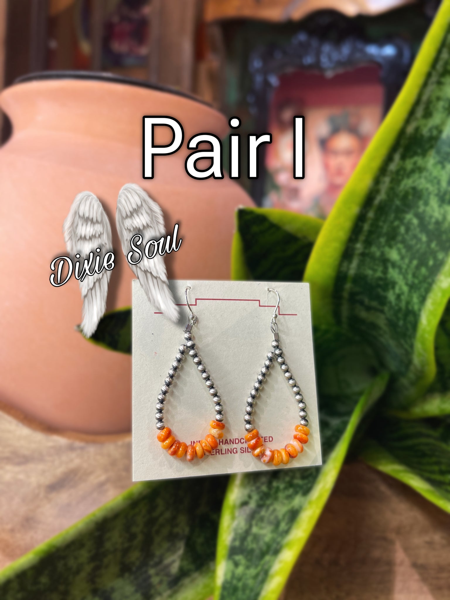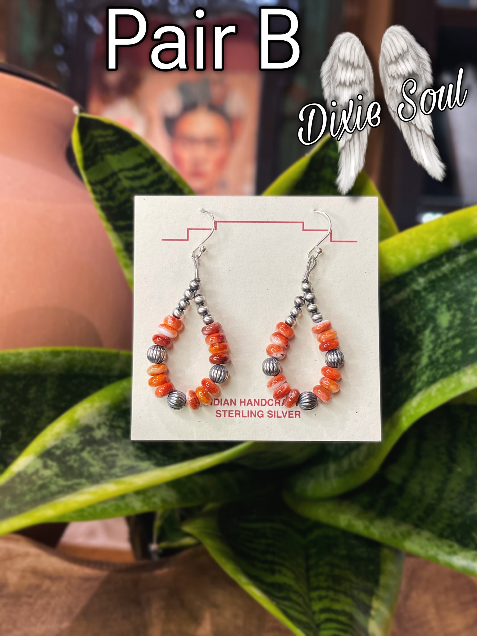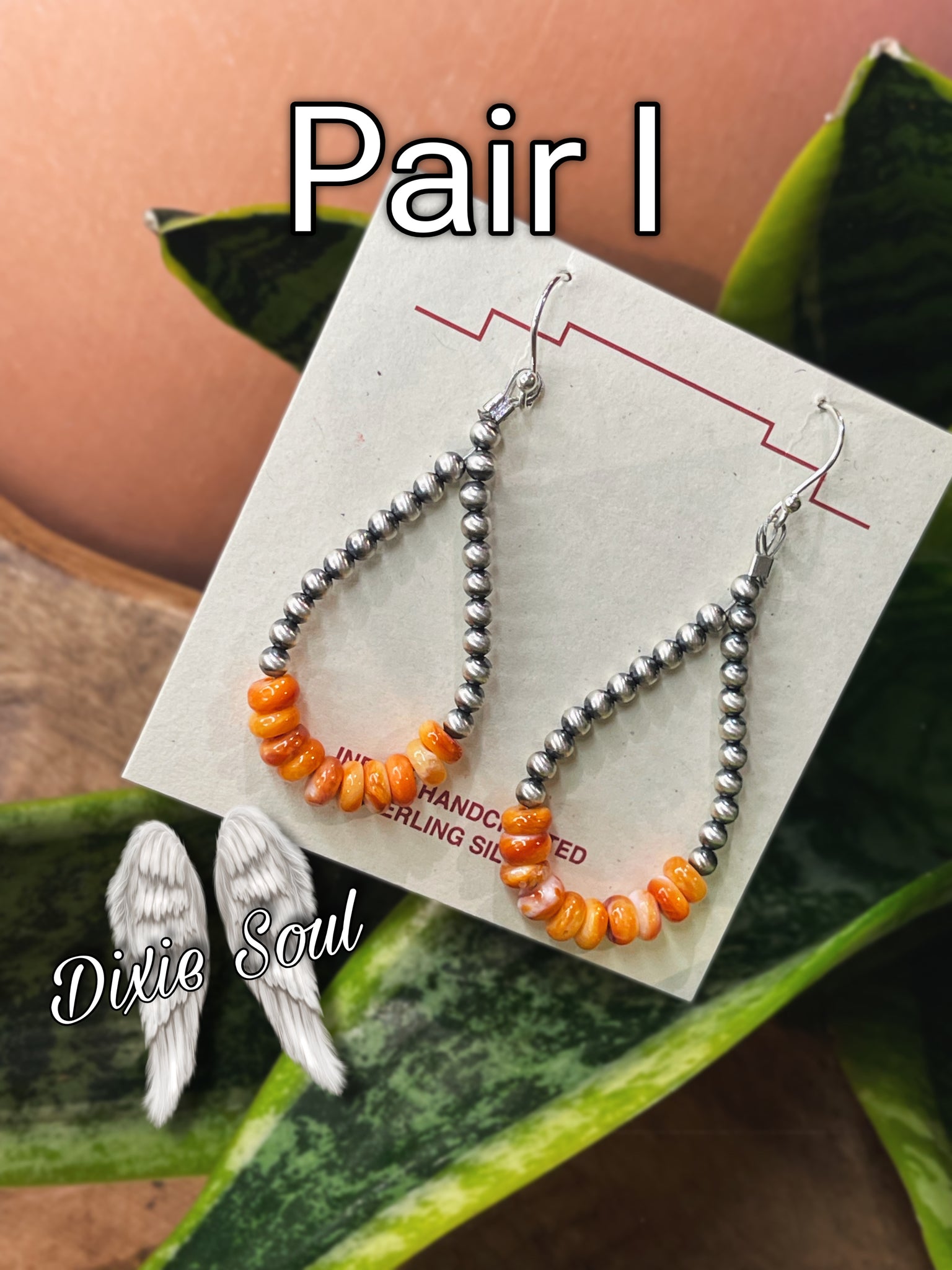 Pair E: 3” 3-6mm sterling round, sterling saucers and reddish-orange spiny oyster. $93