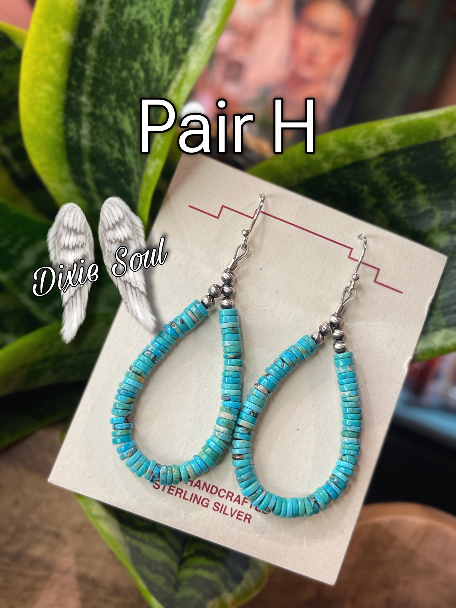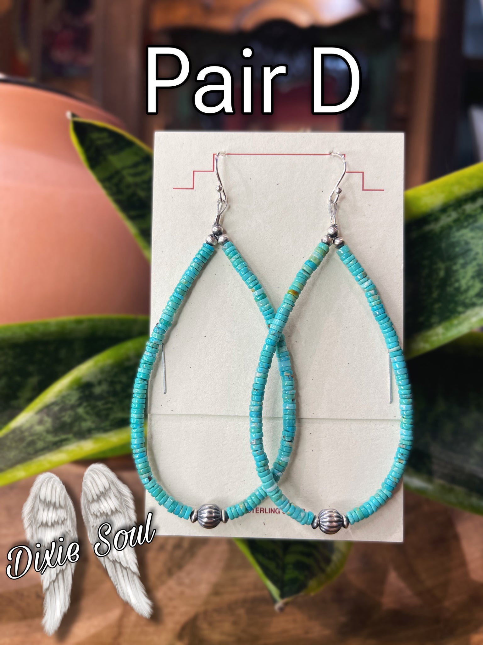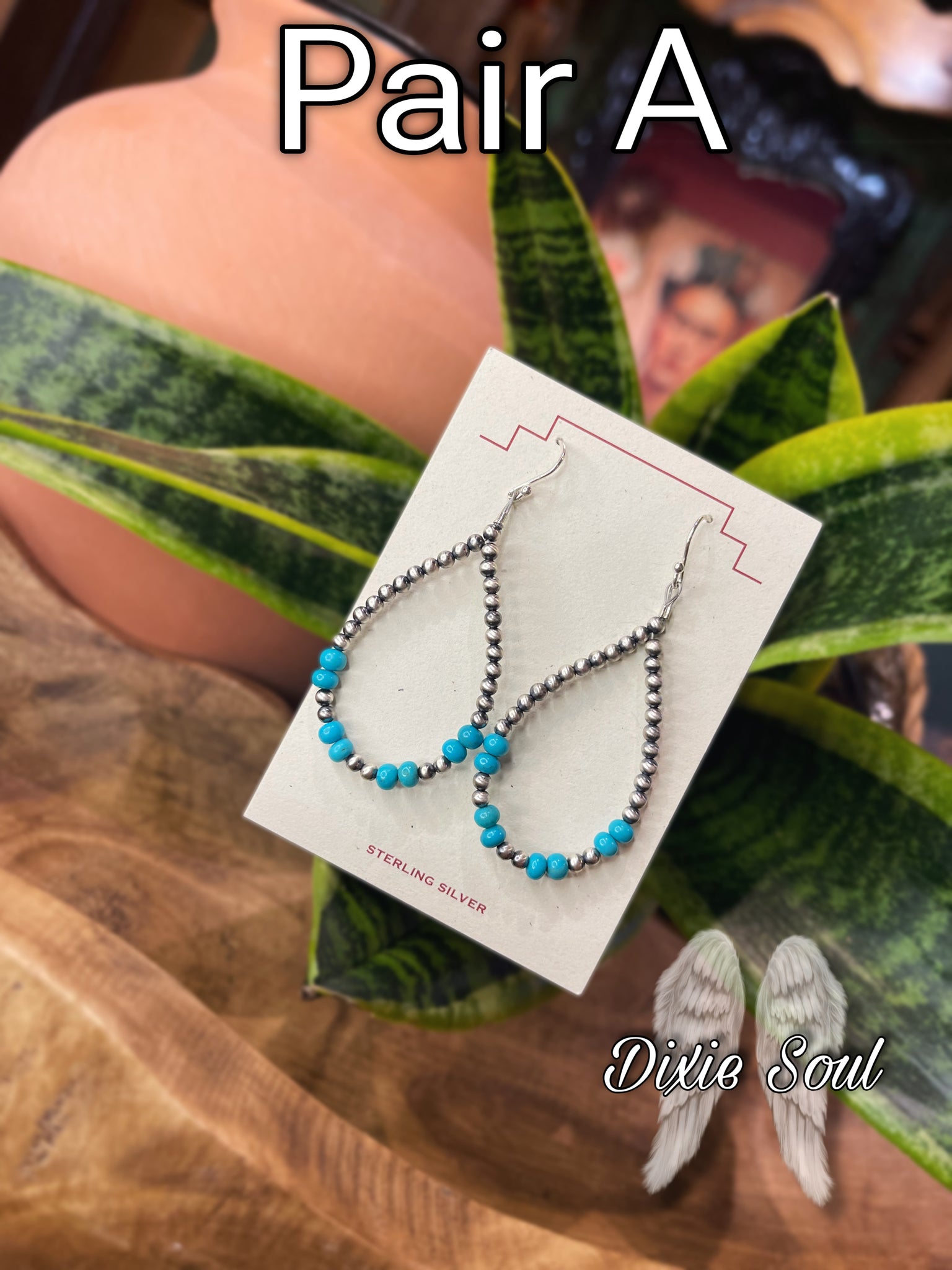 Pair H : 2.5” Mainly all turquoise with a few 3mm sterling upper pearls. $84