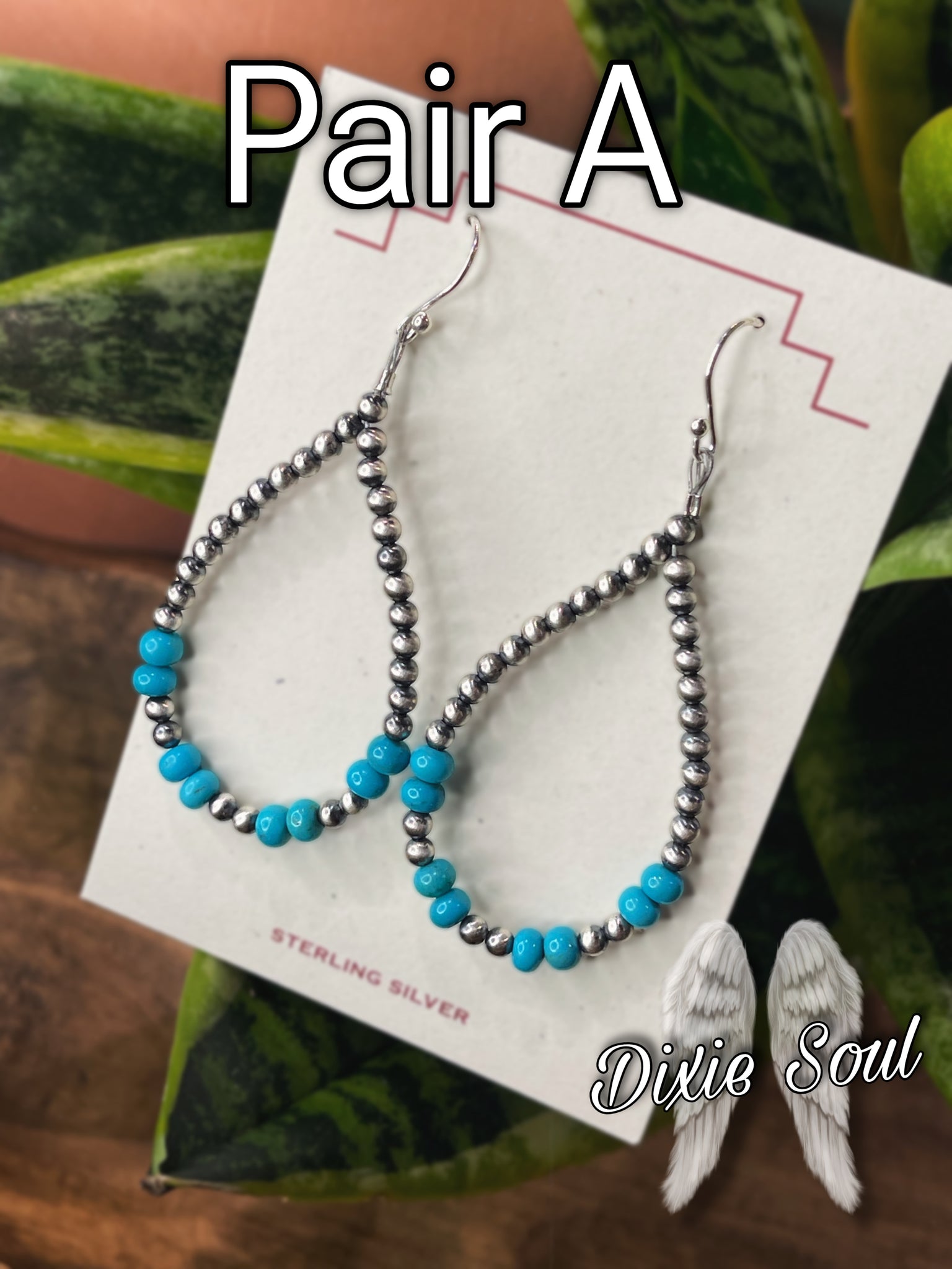 Pair A: 2.5” in length, 3mm sterling pearls with aprx 4mm turquoise. $60