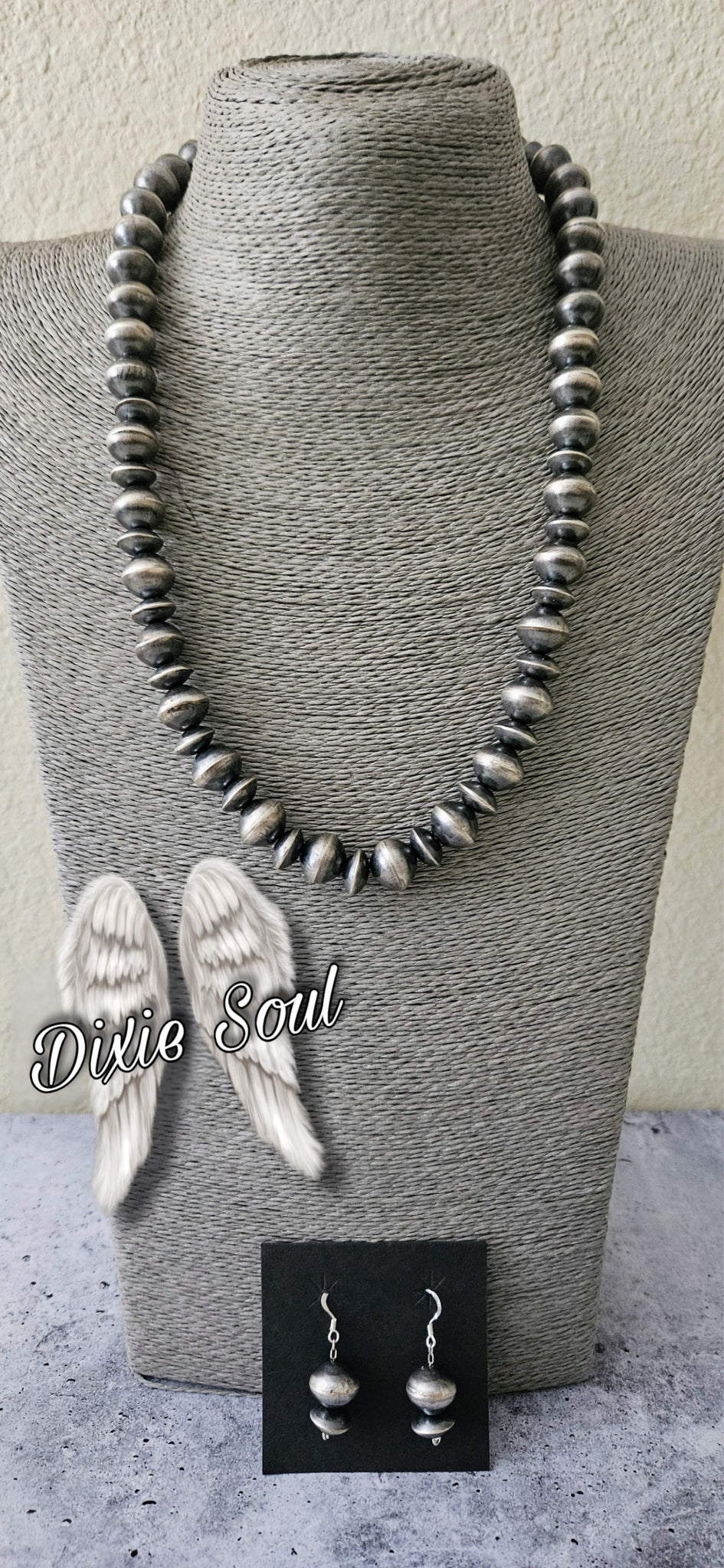 22.5 inches in length, the handmade sterling silver Navajo Pearls are Virginia’s smooth ‘Round’. 12mm and Saucers (10mm) Earring are included $1140