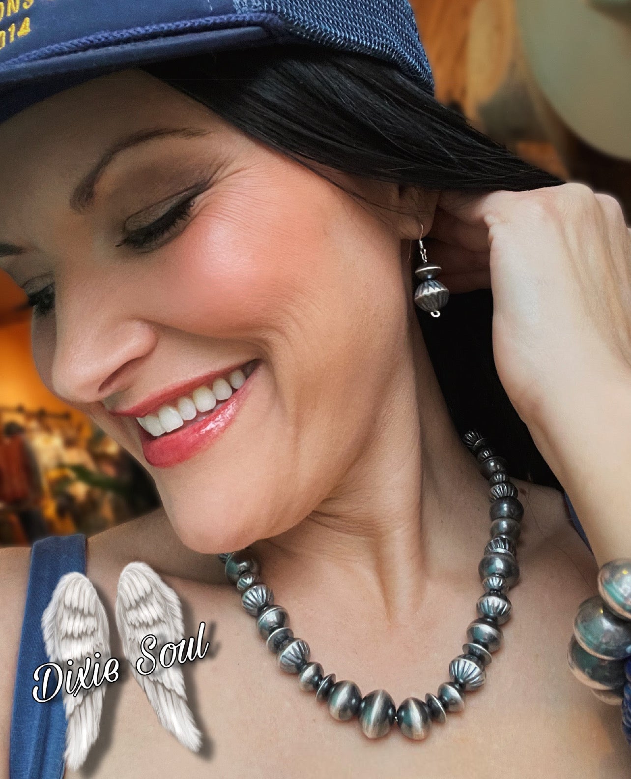 19 inches in length, the handmade sterling silver Navajo Pearls have a center pearl at 15mm, slightly smaller varying pearls surround. Earring are included $1170