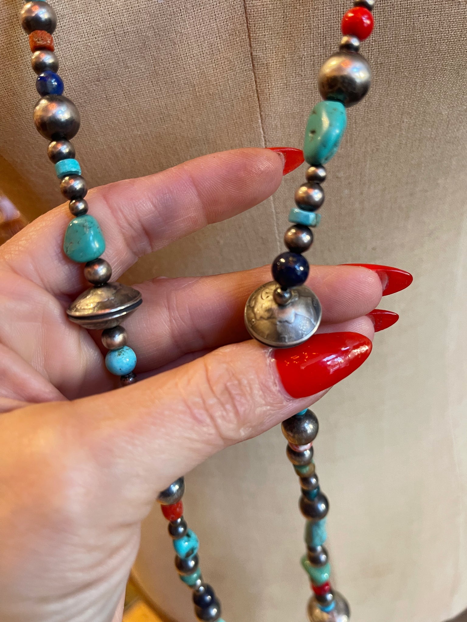 Muti Colored Mercury Dime Pearl Necklace: 59” in length Mercury Dime Navajo Pearls,Mixed sizes of vintage sterling pearls, Green & blue tq, coral, lapis, spiny oyster beads. Lobster Claw catch. Can be double or tripled depending on individual’s neck size. $1390