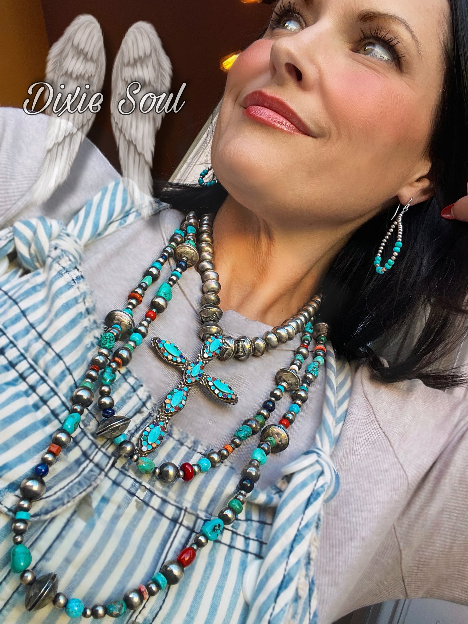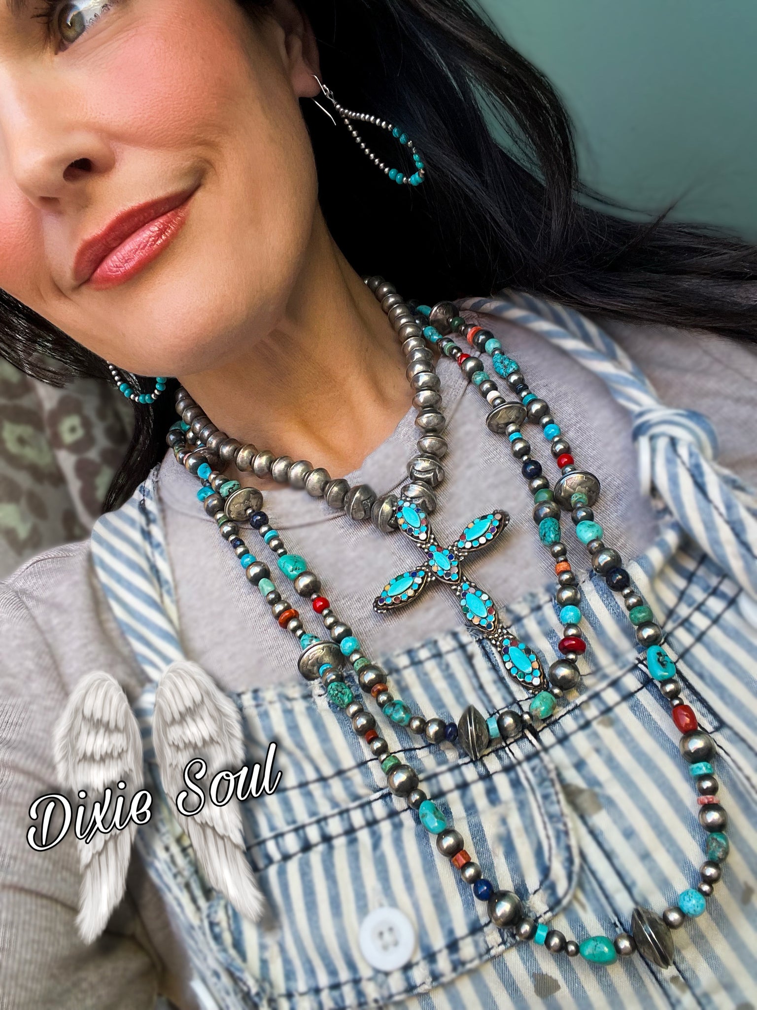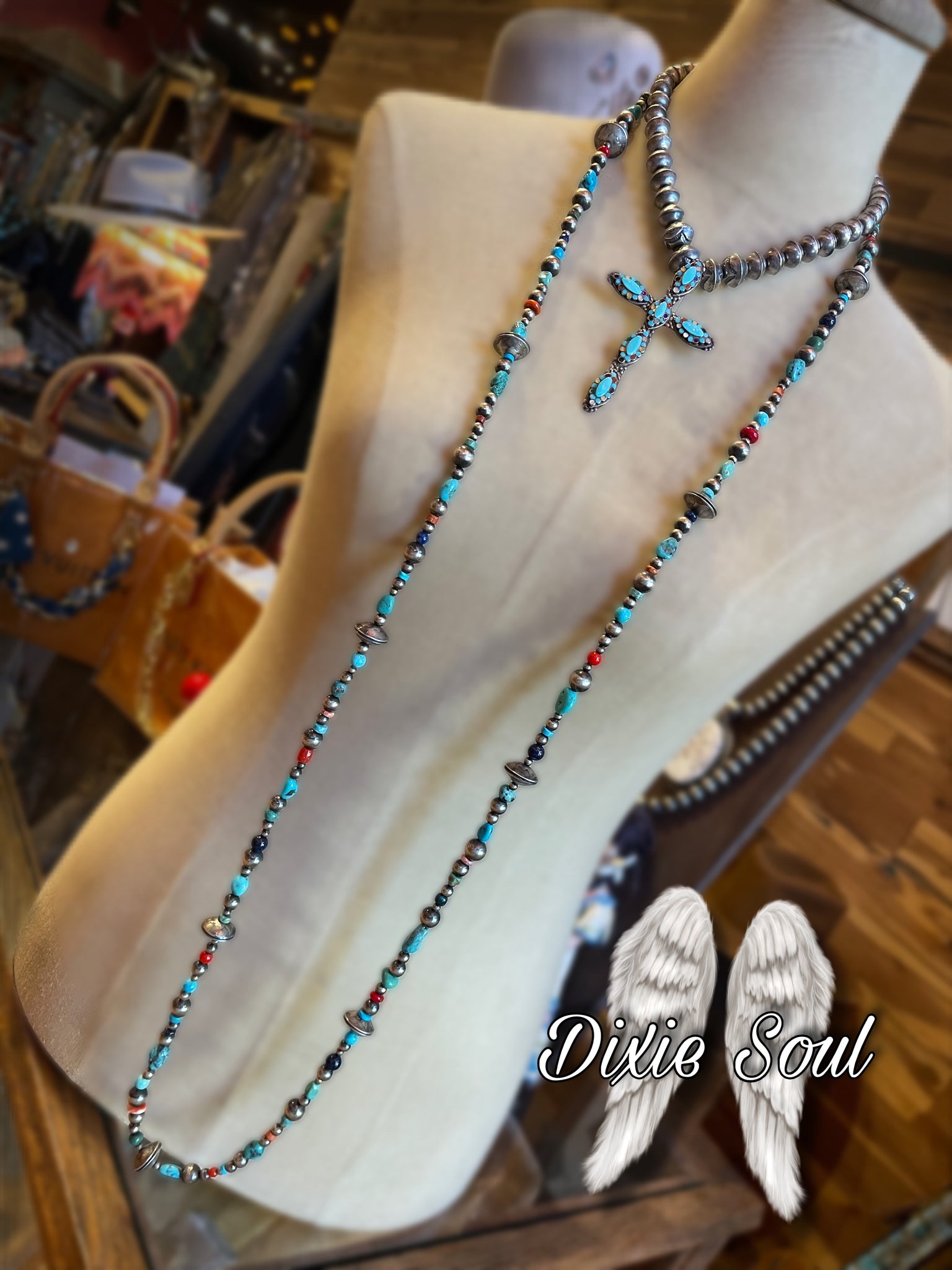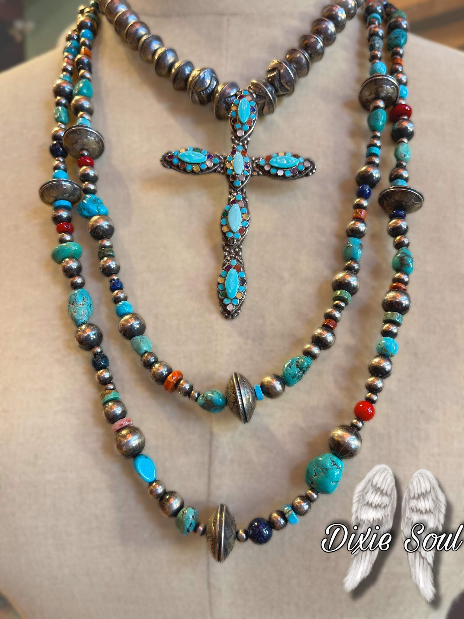 Cross Necklace: Vintage Turquoise Inlaid Cross Necklace, surrounded by a mixture of Vintage handmade sterling pearls. Turquoise, lapis, coral, mother of pearl, shell, malachite,  spiny are all set in sterling. Cross is attached to necklace. Cross measures 3.75”x 2.5”. Necklace measures 18”  $1450