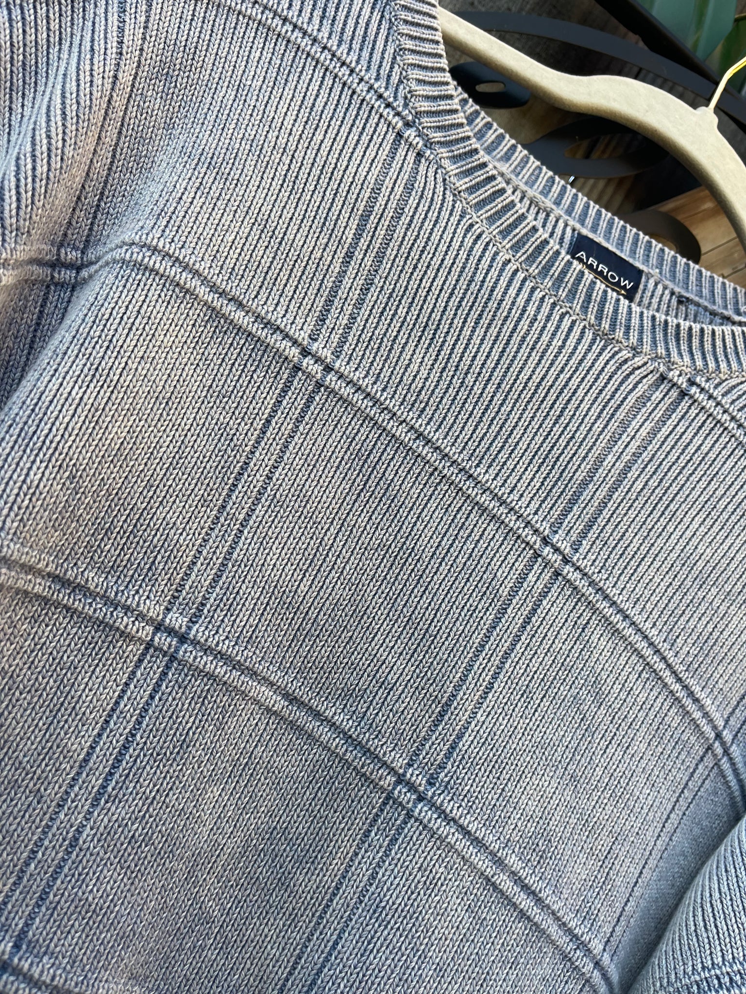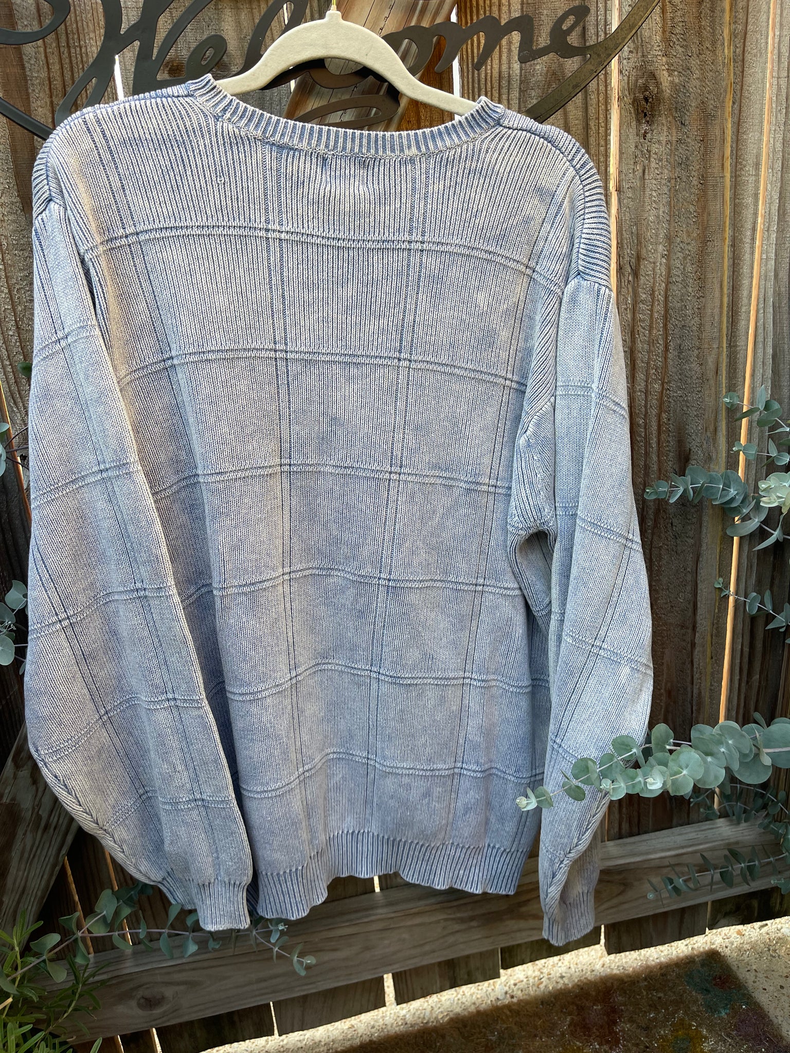 The acid washed process causes a unique color fading and darking process. Color variation will vary from sweater to sweater. Distressing will also vary. Bust measurement is provided, other measurements available upon request.