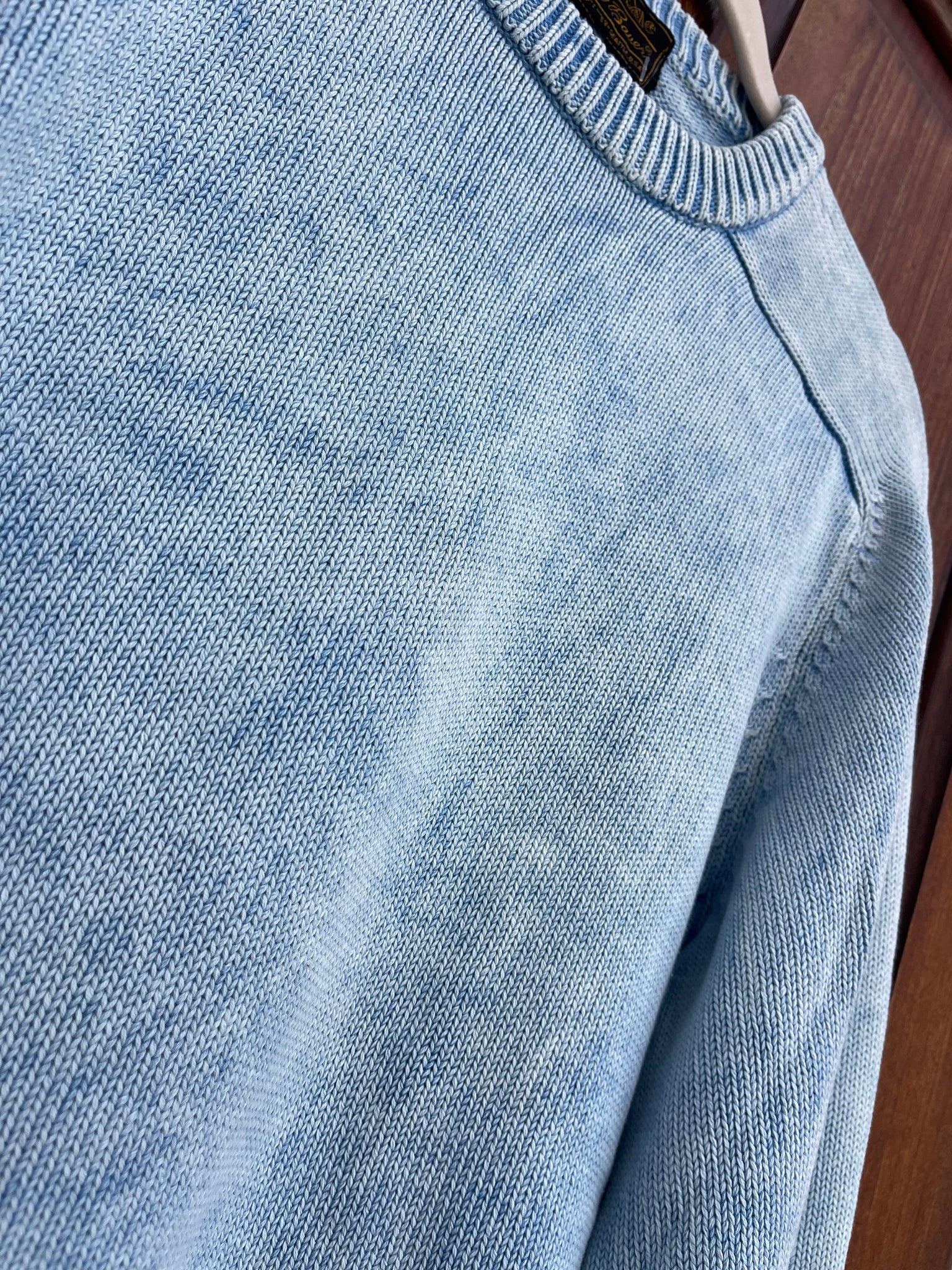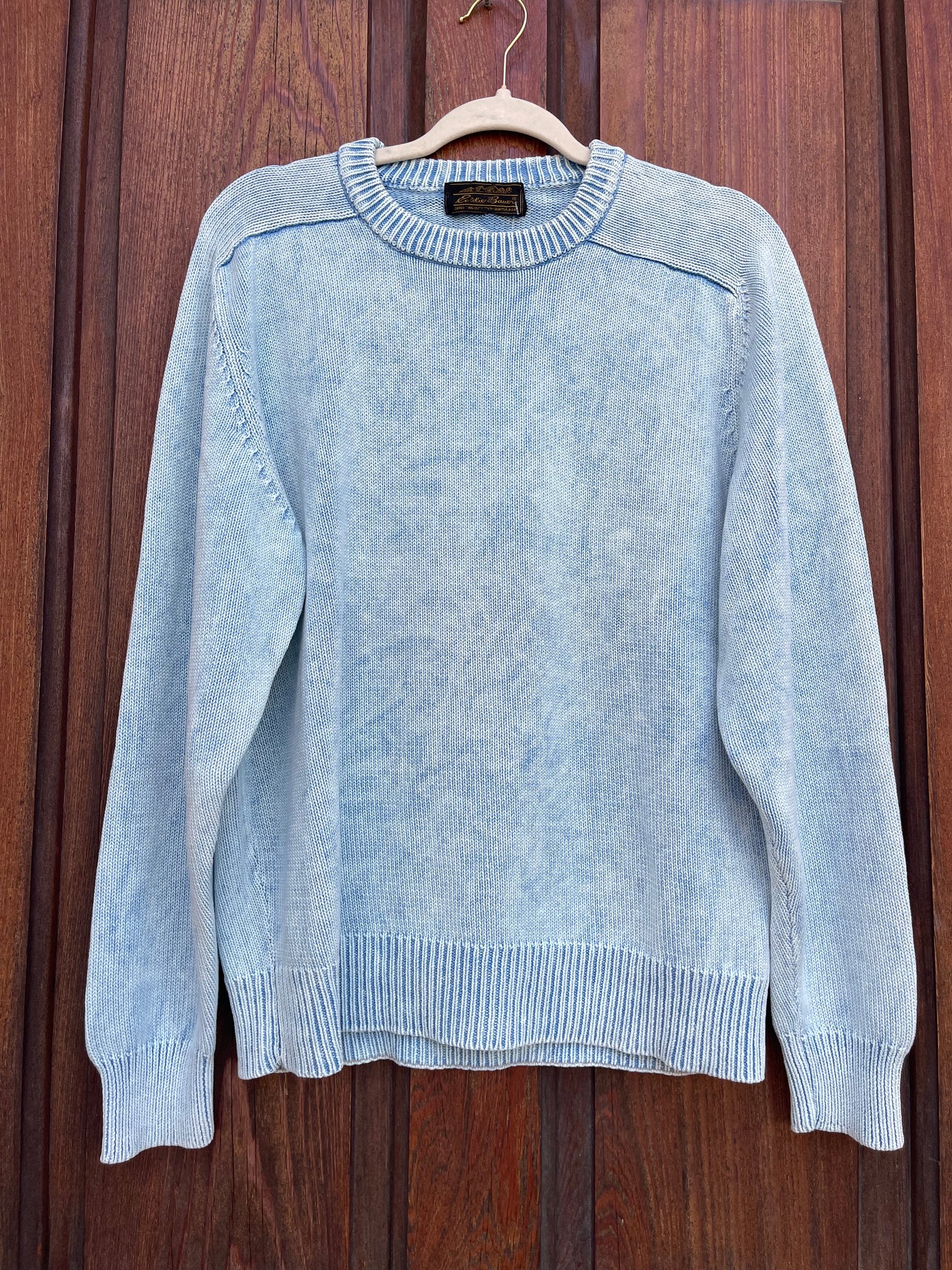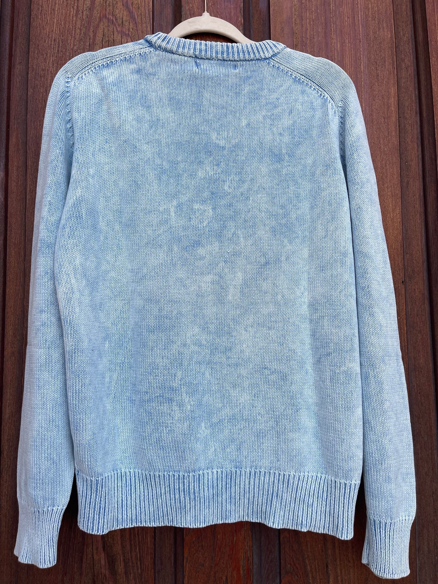 The acid washed process causes a unique color fading and darking process. Color variation will vary from sweater to sweater. Distressing will also vary. Bust measurement is provided, other measurements available upon request.