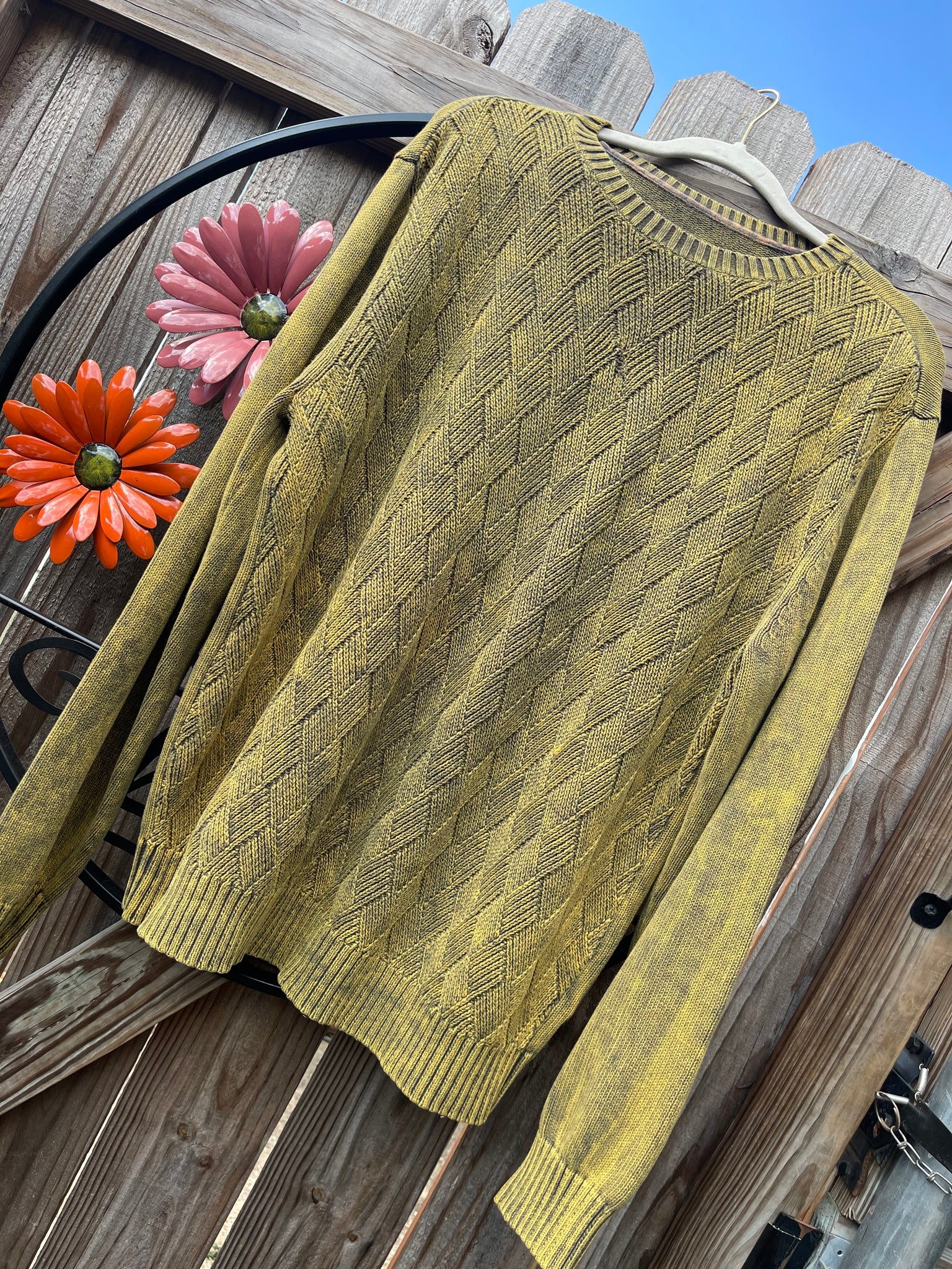 Recycling/restyling at its best. Our ‘new’ sweater collection at Dixie Soul, takes older & vintage sweaters, acid washes them, and creates a new life. Made up of various brands, textures, weights and sizes. While most will have an oversized fit, bust measurements are as follows. Each sweater will vary. Bust size 25” across front or 50” bust circumference. This is an un-stretched measurement.