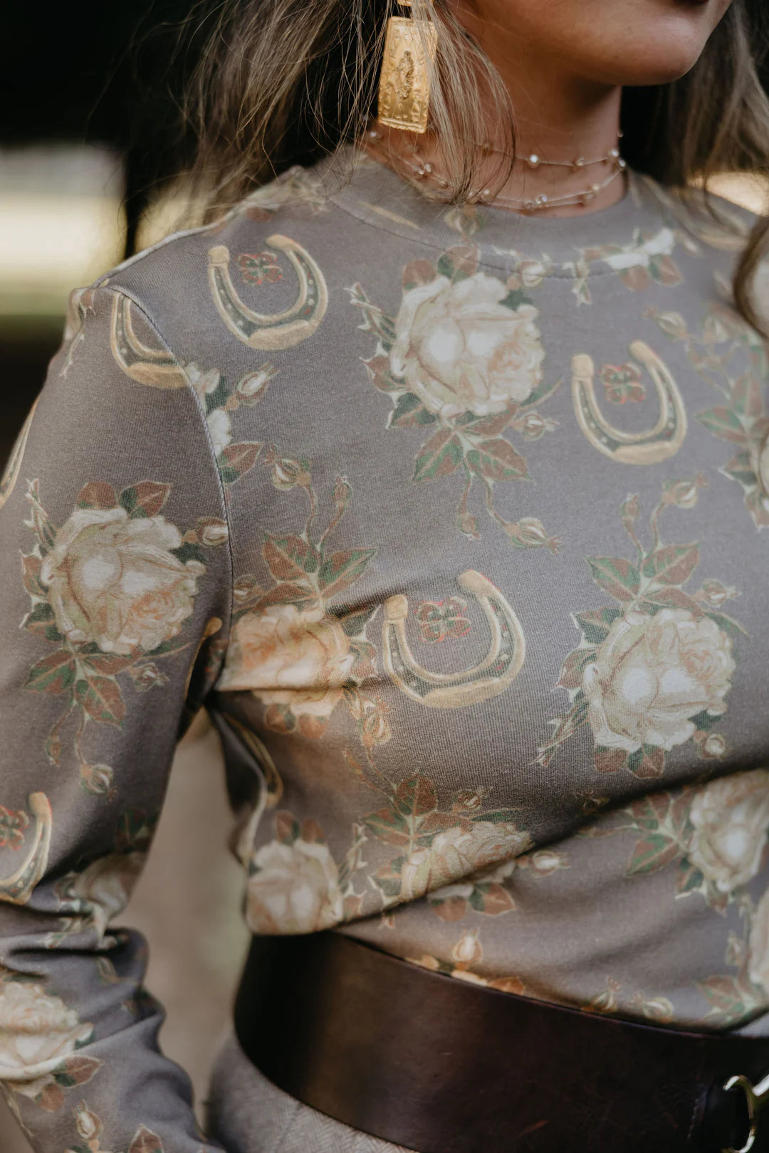 The Lucky Belle Long Sleeve is a love story—soft, timeless, and full of meaning. In a classic cream silhouette, it features the Gilded Lily toss print of roses, horseshoes, and hidden four-leaf clovers, echoing Lily’s family-rooted tale of love and luck. It’s a long-sleeved layer of romance, heritage, and cowgirl heart.
