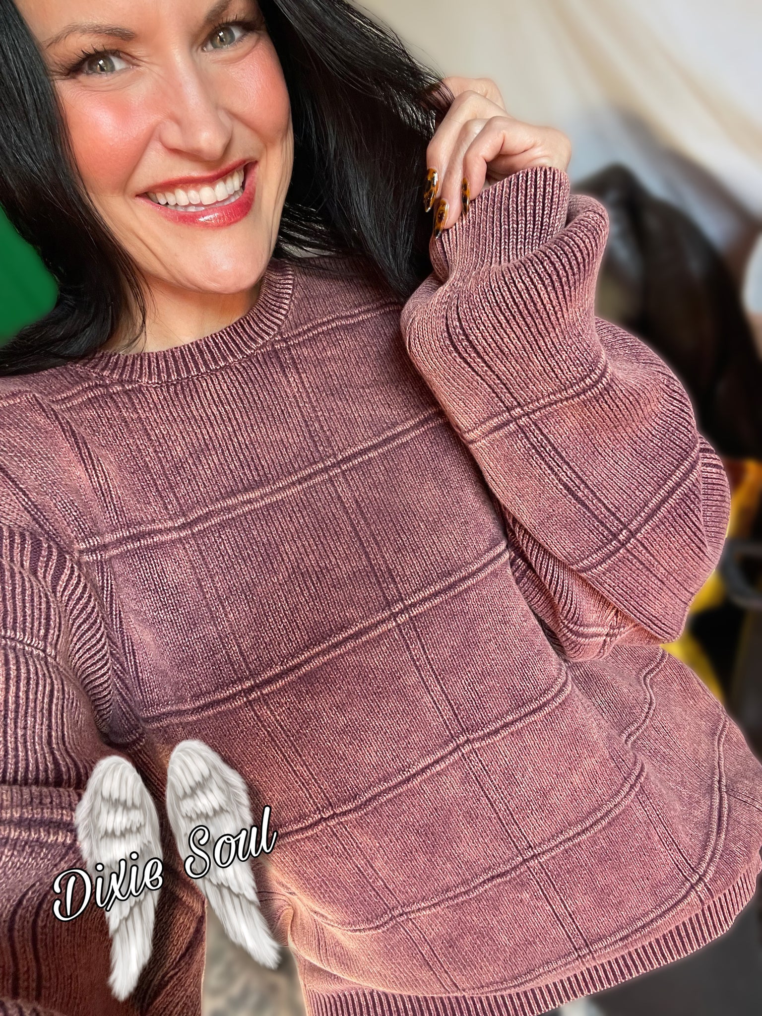 Recycling/restyling at its best. Our ‘new’ sweater collection at Dixie Soul, takes older & vintage sweaters, acid washes them, and creates a new life. Made up of various brands, textures, weights and sizes. While most will have an oversized fit, bust measurements are as follows. Each sweater will vary. Bust size 25” across front or 50” bust circumference. This is an un-stretched measurement.